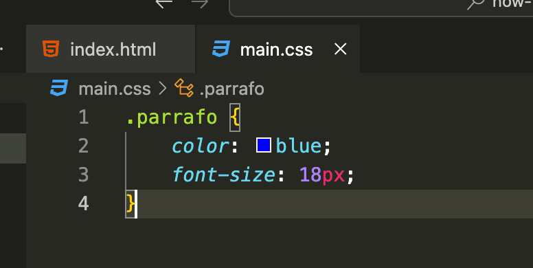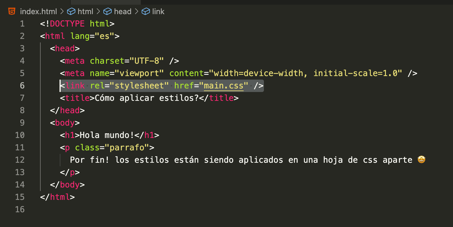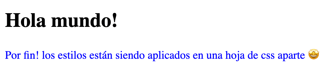 Por último, debido en gran parte a la cantidad de problemas que nos evita a largo plazo, la manera aplastantemente más aceptada de aplicar estilos es usar hojas de css externas. Para ello creamos un enlace a dicha hoja usando la etiqueta <link> dentro del header de nuestro html. Adicionalmente, usando el atributo class de nuestra etiqueta <p> hacemos que nuestro texto responda a la clase parrafo que nos encontraremos dentro de nuestra hoja de estilos