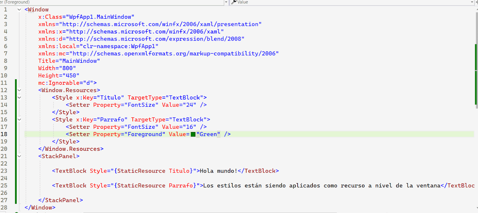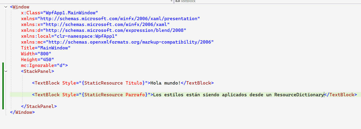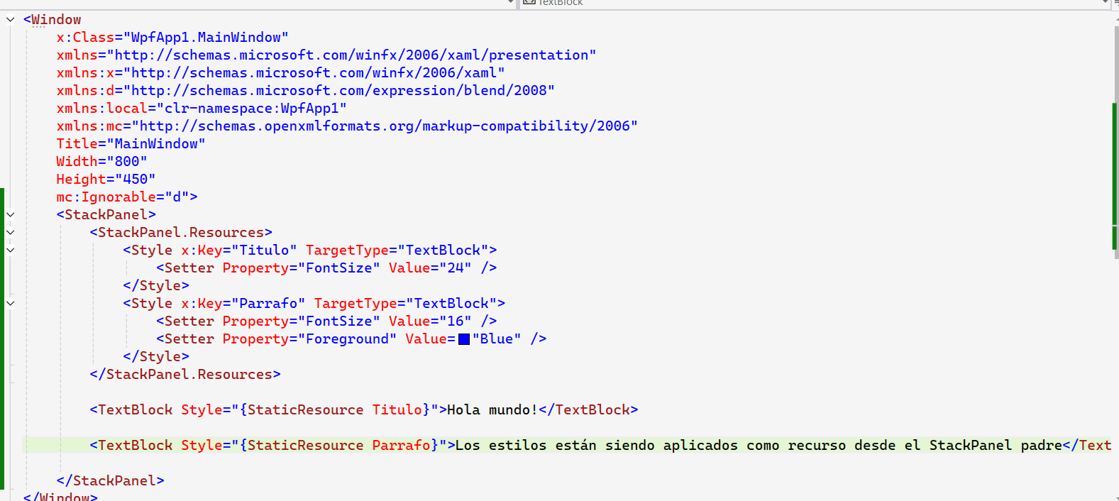 El padre inmediato de nuestros controles de TextBlock es StackPanel, podemos definir allí los estilos que tendrá nuestro título y nuestro párrafo como recurso