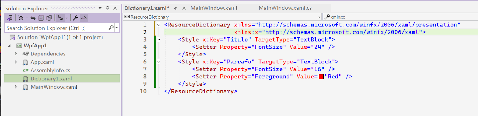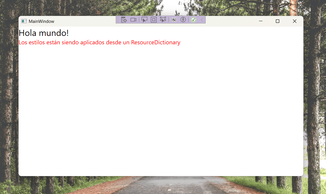 Nota: Podemos usar varios ResourceDictionaries a la vez para modularizar nuestros estilos y aplicarlos a nuestra aplicación anidandolos dentro de <ResourceDictionary.MergeDictionaries>